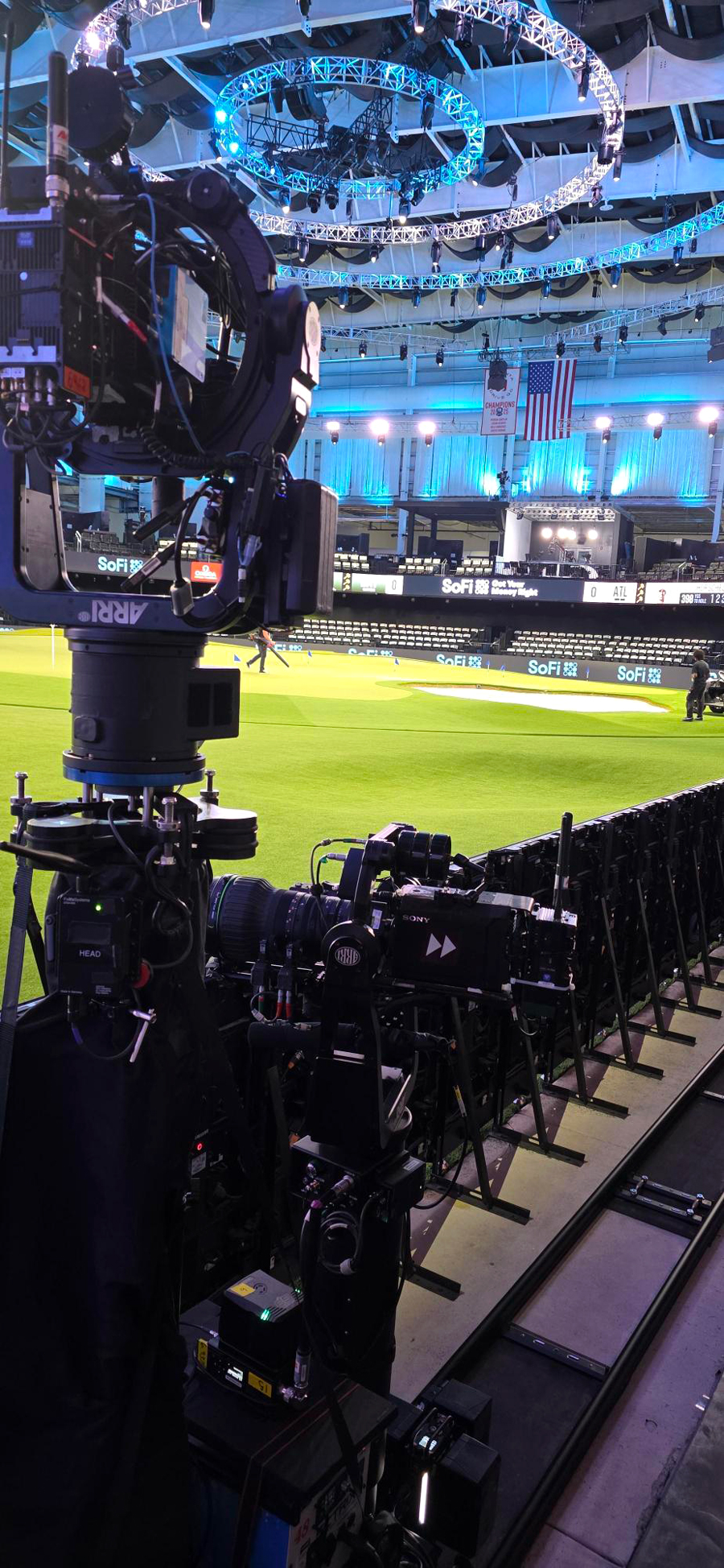 - A dynamic cable cam sweeping above the arena