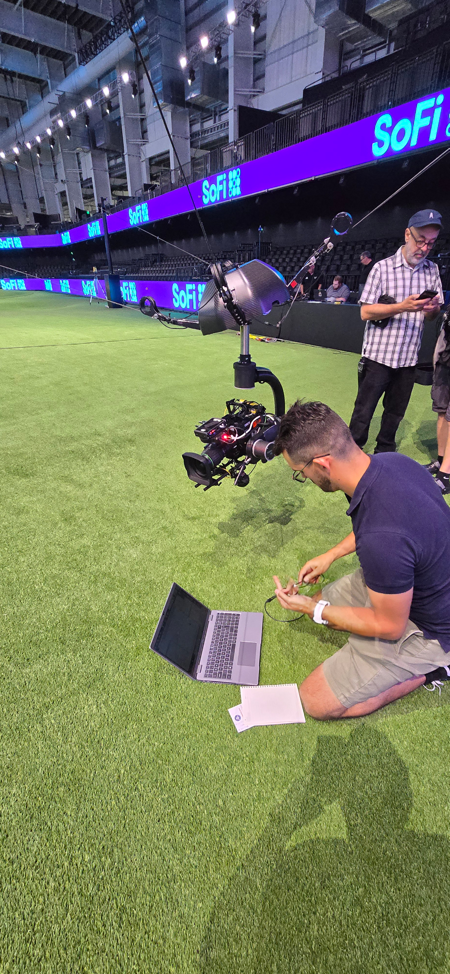 AirPixel's wide-area tracking system, built on ultra-wideband (UWB) radio technology, was deployed throughout the SoFi Centre. Working on a similar principle to GPS – where a receiver calculates its position by communicating with a network of fixed reference points – AirPixel places a compact tracking device (the rover) on the camera, and a series of beacons around the venue.