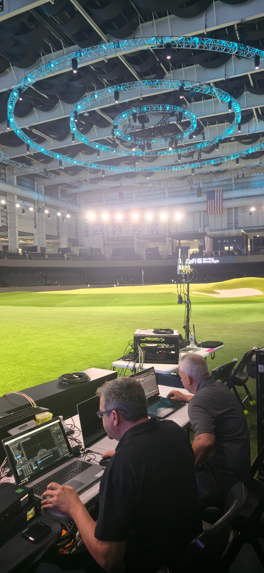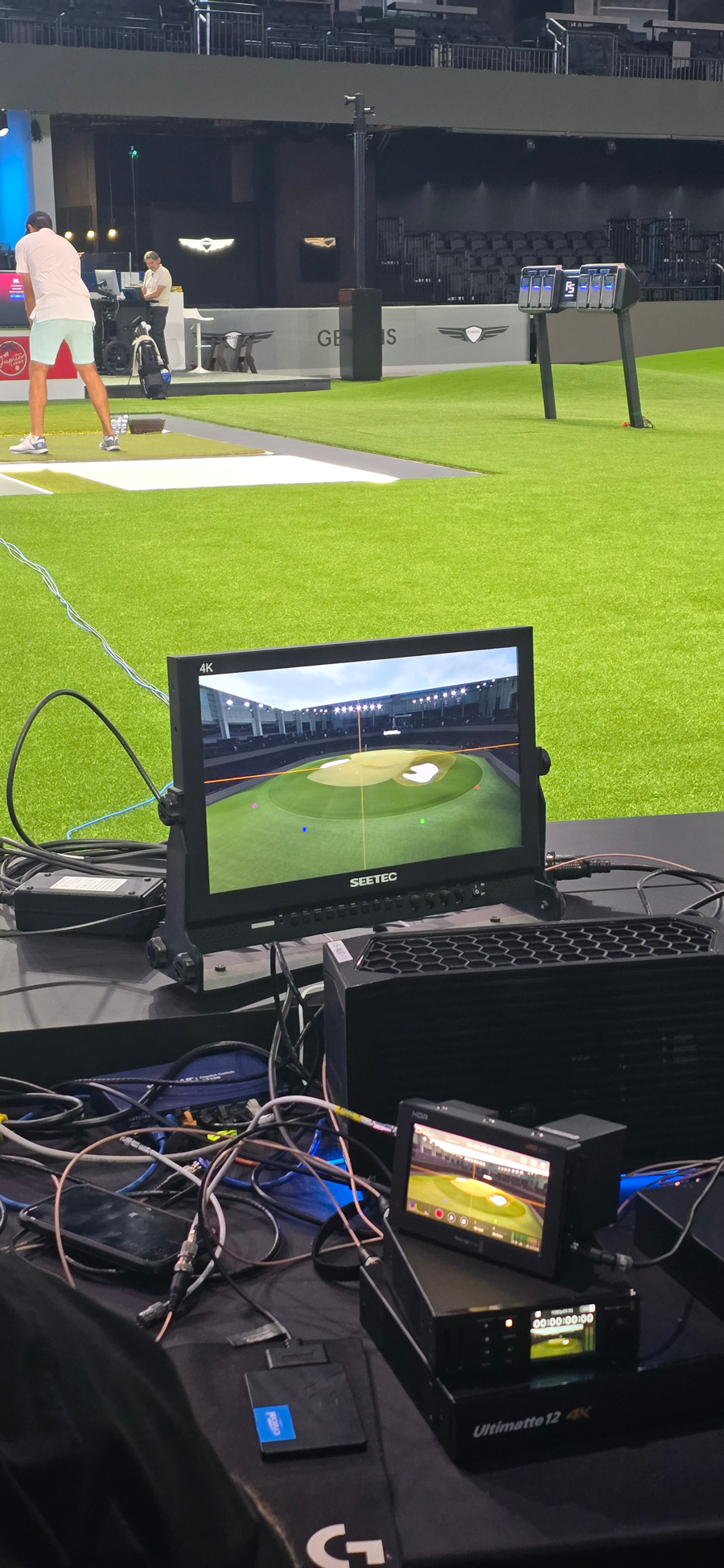 Rovers were mounted directly onto the cable cam and rail camera, giving each one continuous, accurate positional data regardless of where it moved. Unlike optical systems, UWB is unaffected by lighting conditions — a significant advantage in a venue where lighting changes dramatically between the virtual course display and the short game complex.